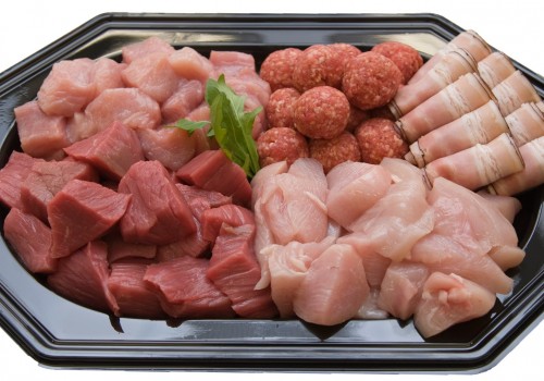 Bestaat uit: biefstuk blokjes, kipfilet blokjes, varkens blokjes, runderballetjes en vinkjes